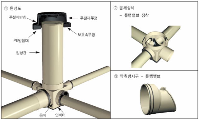| 7 | 방취구 | 플랩밸브(Flap Valve)형 - 몸체내부 접속 형태로 D100x75의 형태 |